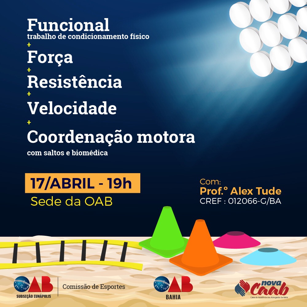 Na noite do dia 17/04 (terça-feira) será realizado o projeto com várias modalidades esportivas com realização de treino funcional/aeróbica, atividades de coordenação motora e resistência, bem como futebol de areia, na sede da OAB/Eunápolis.