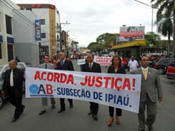 Representantes de sete cidades (Ipiaú, Ubatã, Ubaitaba, Aurelino Leal, Itagibá, Ibirapitanga e Ibirataia), entre advogados, integrantes da Maçonaria, prefeitos (entre eles o de Aurelino Leal), vereadores, o Presidente da Câmara de Ipiaú, Antônio Raimundo Menezes, a Diretoria da Subseção de Ipiaú e o Vice-Presidente da Seccional baiana da OAB, Antônio Menezes, participaram, nesta terça-feira (11), de caminhada contra o mau funcionamento da Justiça Estadual, nas sete comarcas que integram a área da Subseção. Houve vários pronunciamentos sobre a situação em que se encontra o Poder Judiciário na Bahia, como a morosidade e a necessidade de criação de mais varas para o município de Ipiaú.