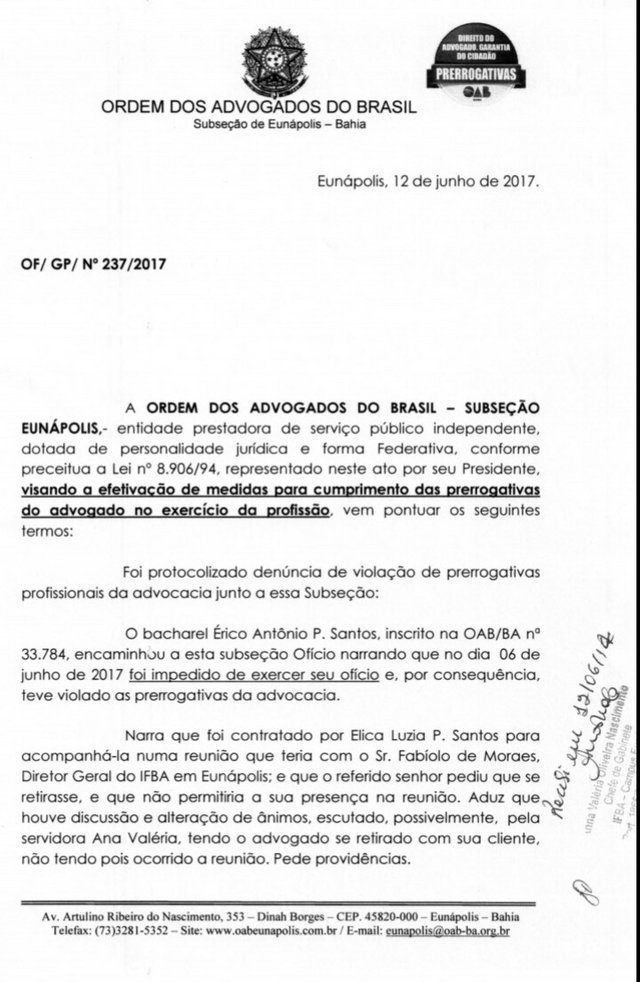 Foi registrada e formalizada reclamação específica na OAB no sentido de que o advogado foi proibido de participar de uma reunião representando interesses da sua cliente, ato que impediu exercício profissional da advocacia, no campus do IFBA na cidade de Eunápolis.