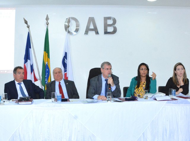 Participaram da mesa alta o secretário-geral da OAB-BA, Carlos Medauar, o secretário-geral adjunto, Pedro Nizan Gurgel, e a tesoureira, Daniela Borges, além de Viana e Ana Patrícia. Foto: Angelino de Jesus (OAB-BA)