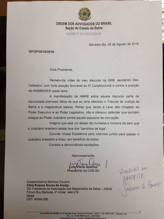 "Penso que, tendo a Lava Jato chegado ao Poder Executivo e ao Poder Legislativo, não é ofensivo defender que também chegue ao Poder Judiciário contra aquele esquema de corrupção", diz Luiz Viana no ofício, em reforço ao discurso feito durante a última sessão do Pleno e enviado à presidente da AMAB por vídeo. Confira o ofício enviado à AMAB e o vídeo com a manifestação do presidente da OAB-BA: