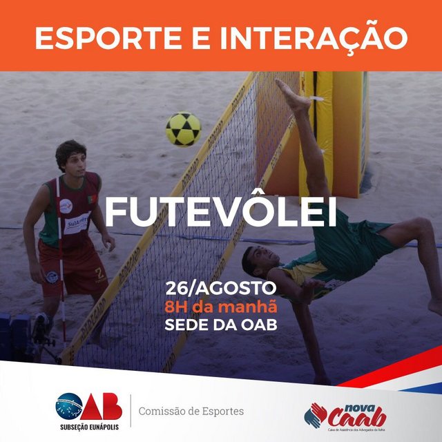 A Comissão de Esporte da OAB - Subseção Eunápolis buscando estimular a prática esportiva/saúde, bem como a integração da classe, realizará Futevôlei no dia 26/08, as 08 horas, na sede da OAB.