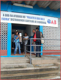 O convênio que originou o projeto "OAB vai à Escola" foi assinado no dia 18 de julho de 2008 entre a Ordem dos Advogados do Brasil – Seção Bahia e a Secretaria Estadual de Educação. De acordo com o protocolo, a OAB-BA indicará advogados para ministrar palestras aos estudantes, em salas de aulas de diversos estabelecimentos de ensino objetivando demonstrar a importância dos direitos e deveres do cidadão aos milhares de jovens do Ensino Médio da Rede Estadual. O projeto viabiliza a distribuição de cartilhas, a qual contém 97 páginas e aborda temas como o meio ambiente, patrimônio público, direitos fundamentais, Estatuto da Criança e do Adolescente, direito do idoso, da família, penal, entre outros, com o objetivo de levar aos jovens o conhecimento dos direitos e deveres estabelecidos no país.
