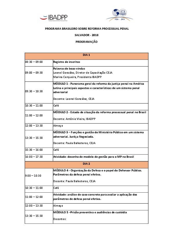 Entre os dias 02 e 05 de abril, será realizada em Salvador-BA a segunda edição do curso Programa Brasileiro sobre Reforma Processual Penal. O evento é uma iniciativa do Centro de Estudios de Justicia de las Américas (CEJA) em parceria com o Instituto Baiano de Direito Processual Penal (IBADPP).