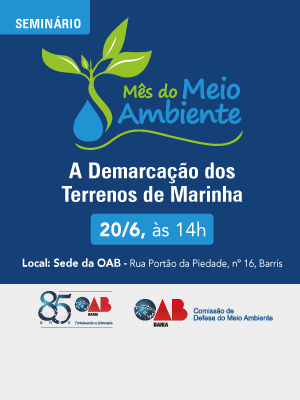 Local: auditório da OAB-BA, na Rua Portão da Piedade. A OAB da Bahia, por meio de sua Comissão de Defesa do Meio Ambiente, promove no dia 20/06 o seminário "A Demarcação dos Terrenos de Marinha", que acontecerá das 14h às 18h, no auditório da OAB-BA, na Rua Portão da Piedade. O evento é gratuito e visa proporcionar um debate sobre os terrenos de marinha, suas demarcações, regulamentações e gestão pública integrada, abordando os papéis da União, dos estados e municípios nesse processo regulamentador. Confira a programação: Programação