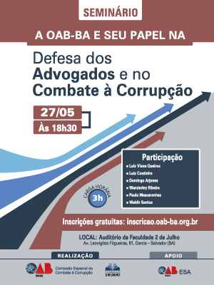 Waldir Santos A OAB da Bahia, através da Comissão Especial de Combate à Corrupção, e a Faculdade 2 de Julho, promovem, nesta quarta-feira (27/05), às 18h30, o seminário “A OAB-BA e seu papel na defesa dos advogados e no combate à corrupção”. Com o apoio da Escola Superior de Advocacia Orlando Gomes (ESA/BA), o evento será realizado no auditório da Faculdade 2 de Julho, no Garcia, e contará com a participação do presidente da seccional, Luiz Viana Queiroz, do diretor-geral da ESA, Luiz Coutinho, do conselheiro Domingo Arjones, do professor Wanderley Ribeiro, do advogado Paulo Mascarenhas e do conselheiro e membro da Comissão Especial de Combate à Corrupção, Waldir dos Santos. Com carga horária de 3h, o seminário possui inscrição gratuita, que pode ser feita no site http://inscricao.oab-ba.org.br