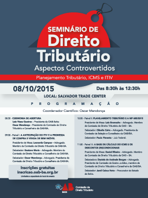 LOCAL: Salvador Trade Center A OAB da Bahia, por meio da sua Comissão de Direito Tributário, promove, nesta quinta-feira (08/10), das 8h30 às 12h30, o seminário “Direito Tributário – Aspectos Controvertidos”. O evento será realizado no Salvador Trade Center, no Stiep, e abordará temas como planejamento tributário, ICMS, e ITIV. A abertura do encontro será conduzida pelo presidente da OAB-BA, Luiz Viana Queiroz, e pelo presidente da Comissão de Direito Tributário, Oscar Mendonça, responsável pela coordenação científica do evento.