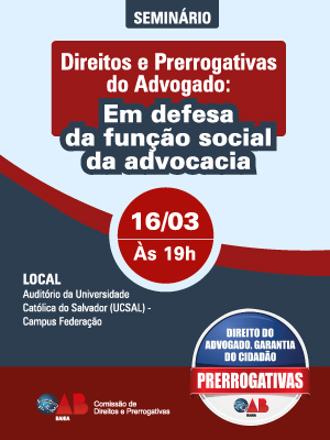 Local: Auditório da Universidade Católica do Salvador (UCSal), Campus Federação. Comissão de Direitos e Prerrogativas da OAB da Bahia promove o "Seminário Direitos e Prerrogativas do Advogado - Em Defesa da Função Social da Advocacia".