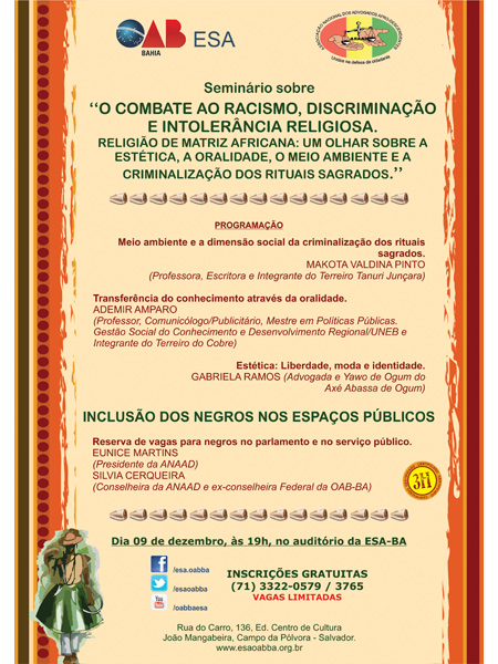 Local: Auditório da ESA-BA, no Centro de Cultura João Mangabeira, ao lado do Fórum Ruy Barbosa. A Escola Superior de Advocacia Orlando Gomes (ESA-BA) promove na próxima segunda-feira (09), às 19h, o seminário "O combate ao racismo, discriminação e intolerância religiosa. Religião de matriz africana: Um olhar sobre a estética, a oralidade, o meio ambiente e a criminalização dos rituais sagrados". O evento acontece na sede da ESA, no Centro de Cultura João Mangabeira, localizado na Rua do Carro, nº 136, no Campo da Pólvora, ao lado do Fórum Ruy Barbosa. As inscrições são gratuitas e podem ser feitas pelos telefones 3322-0579 e 3322-3765. Vagas limitadas.